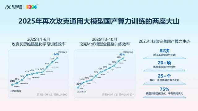 11月6日发布的讯飞星火X1.5,在华为昇腾910B芯片上完成训练,攻克了MoE(混合专家)模型全链路训练效率难题——训练效率从原来只有英伟达A800的30%提升至现在的93%;同时,讯飞星火X1.5还攻克了长思维链强化学习的技术难点,将训练效率从原来只有英伟达A800的30%提升到了84%。这意味着同样的训练任务,讯飞已经能基于全国产算力训练完成。