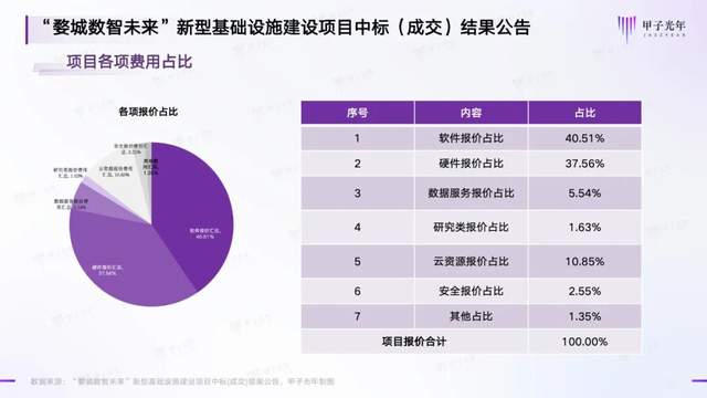 根据该项目中标(成交)结果公告,硬件报价约占总项目报价约38%,而软件报价占比约41%,超过了硬件报价占比,如果再加上数据服务和云资源的报价,软件及相关服务的报价占比就达到了约57%。