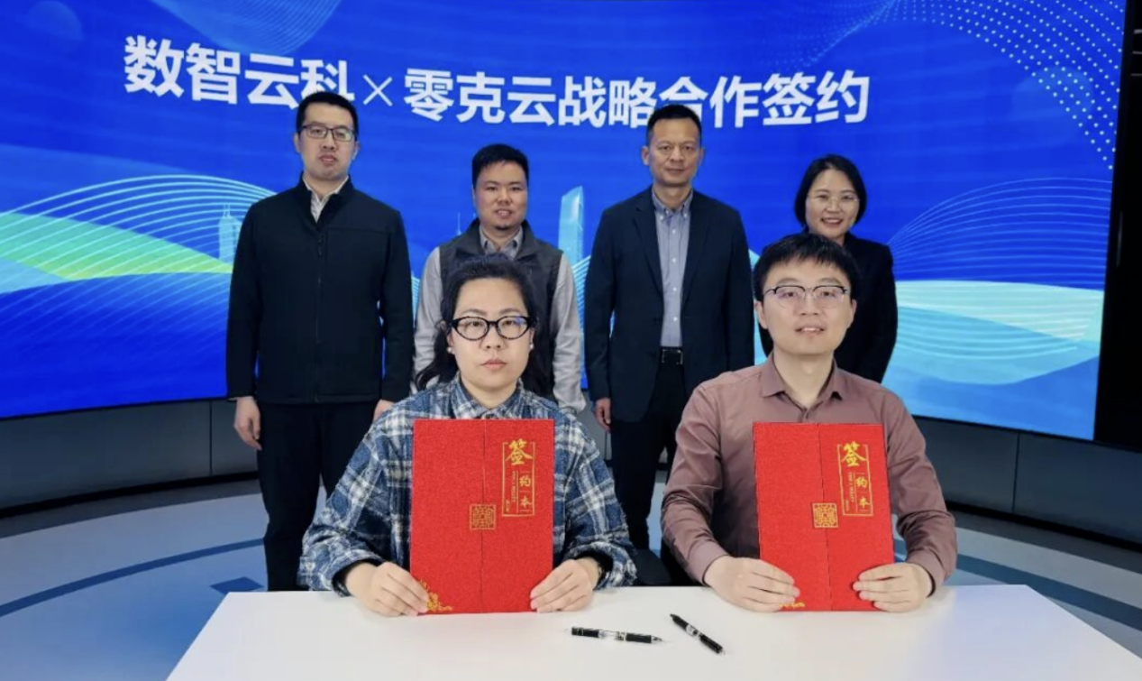 在中关村朝阳园管委会领导,零克云联合创始人、AIGCLINK发起人占冰强,智云科总经理冯莎莎的见证下,零克云解决方案部总监肖姗与数智云科产研首席研究专家、北京市数字人基地负责人李松正式签署战略合作协议。
