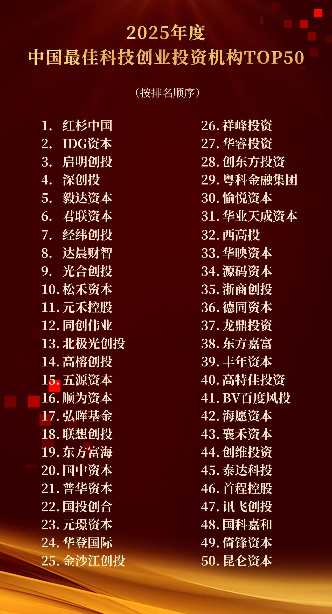 2025年度中国最佳科技创业投资机构TOP50