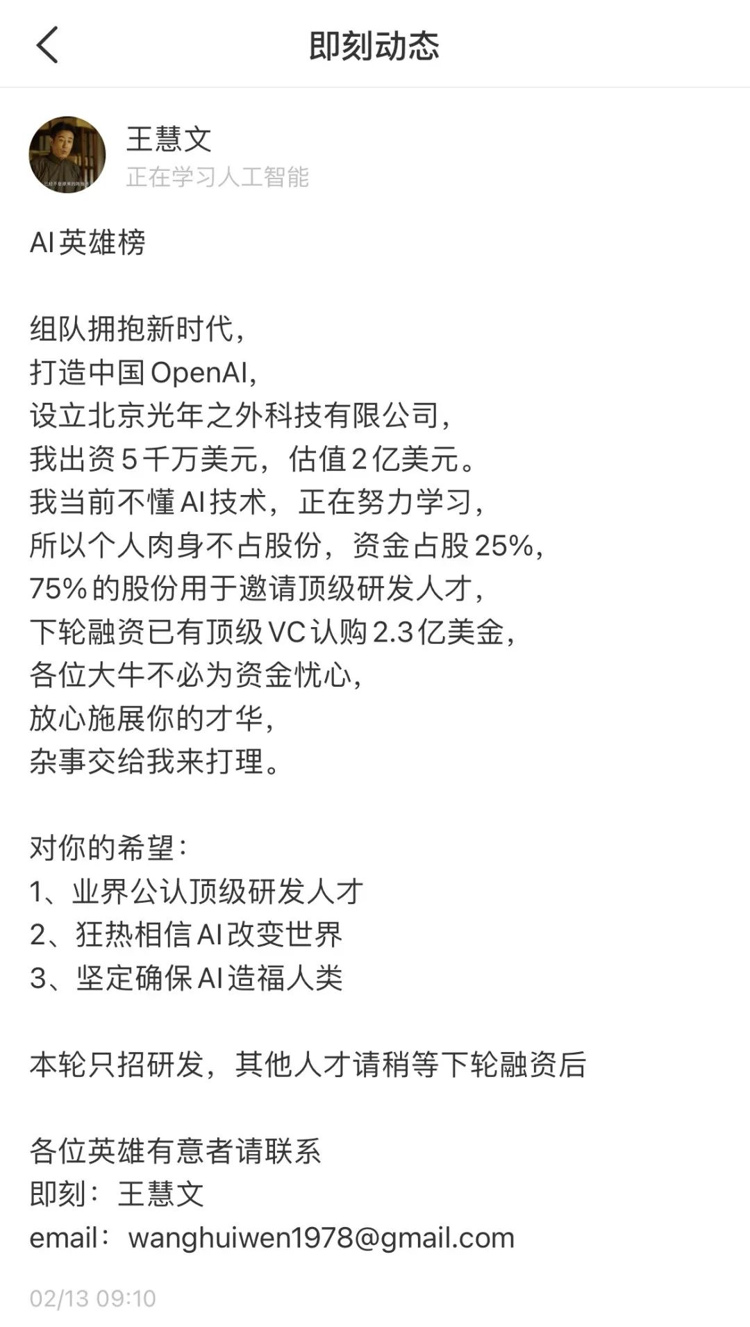 两天后,王慧文对外发布了创立大模型公司光年之外的想法:2月13日上午9点10分,王慧文在即刻上发布了AI英雄榜的招聘帖,称要“打造中国OpenAI”。