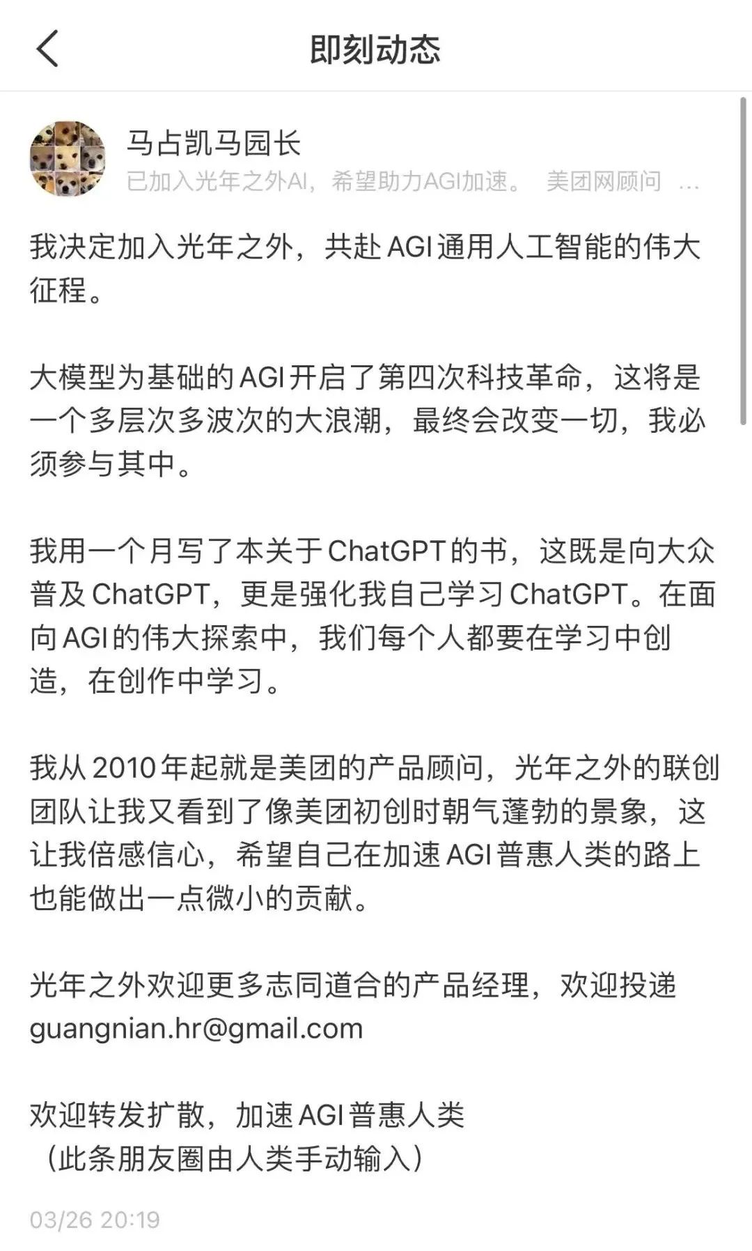3月26日,有着“搜狗输入法之父”之称的马占凯在社交媒体宣布加入光年之外。马占凯说:“大模型为基础的AGI开启了第四次科技革命,这将是一个多层次多波次的大浪潮,最终会改变一切,我必须参与其中......光年之外的联创团队让我又看到了像美团初创时朝气蓬勃的景象,这让我倍感信心,希望自己在加速AGI普惠人类的路上也能做出一点微小的贡献。”