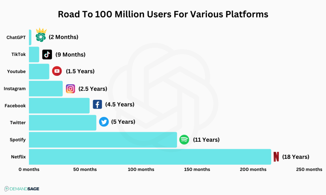 在发布后的短短第5天,ChatGPT就获得了100万用户;又过了两个月,ChatGPT迈过了1亿用户大关。ChatGPT是有史以来达成这两项指标最快的产品。