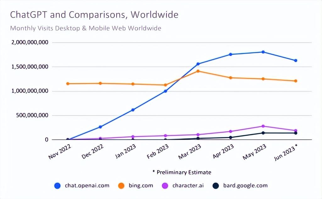 看起来,ChatGPT不会成为世界上最大流量的网站了,它对全球最大流量网站的谷歌所造成的威胁也将止步于此。