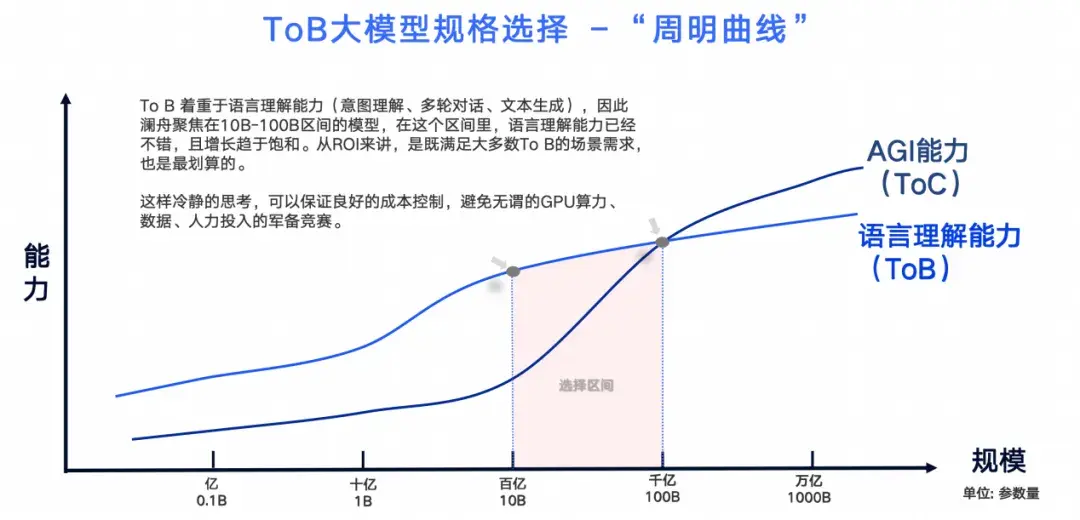 但我们也考虑了落地。落地的时候不能无限追Scaling Law,因为要考虑成本问题。在to B场景,大模型到底需要多大?我将其总结为“周明曲线”。