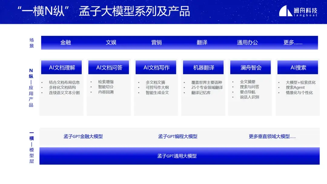 周明:一横首先有两个标准的通用大模型,一个13B,一个40B,有三个垂直模型——金融大模型、编程大模型,以及其他行业的垂直模型;N纵是一些具体场景的能力,包括文档理解、文档问答、文档写作、机器翻译、会议分析、文档检索等能力。