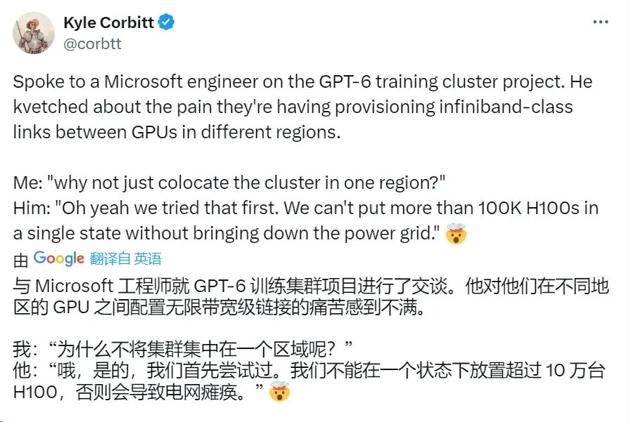 有网友做了计算,如果十万个H100同时开启,功耗将达到70MW。正常来说一般大型电厂输出功率能达到2000MW,70MW负载其实并不大,但突然在电网中增加70MW的负载,就很容易让电网系统出问题。