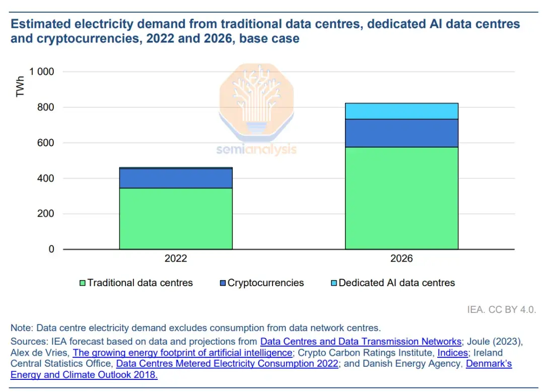 传统数据中心、加密货币、专用AI数据中心的预计电力需求,图片来源:SemiAnalysis