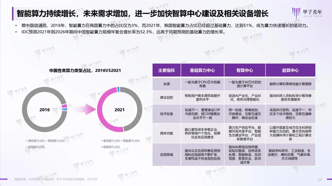 甲子光年智库在《中国AIGC产业算力发展报告》中指出,智能算力持续增长,未来需求增加,进一步加快了智算中心建设及相关设备增长。