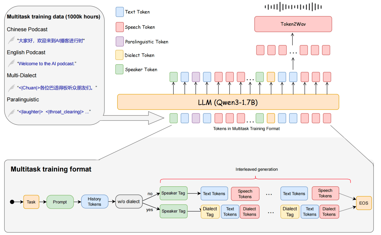 整体SoulX-Podcast模型基础结构上采用了常用的LLM + Flow Matching的语音生成范式,前者建模语义token,后者进一步建模声学特征。在基于LLM的语义token建模方面,SoulX-Podcast 以 Qwen3-1.7B 作为基座模型,并基于原始文本模型参数进行初始化,以充分继承其语言理解能力。
