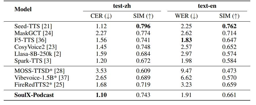 SoulX-Podcast在通用TTS上的表现,*官方模型的复现结果