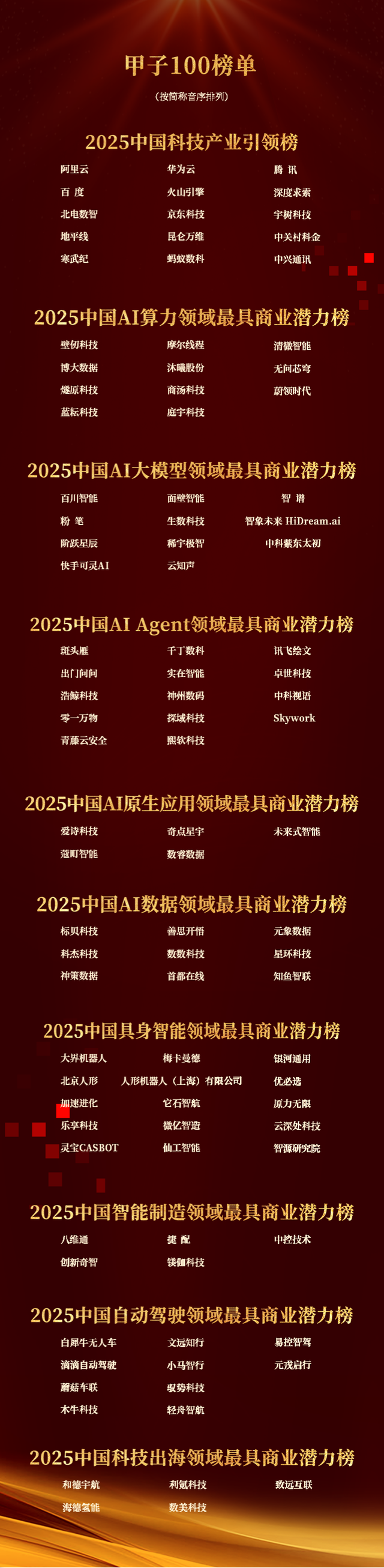 【甲子100】与【甲子Cool Vendor】榜单覆盖人工智能、具身智能、智能制造、自动驾驶、科技出海等核心赛道,全景呈现科技产业的年度突破。