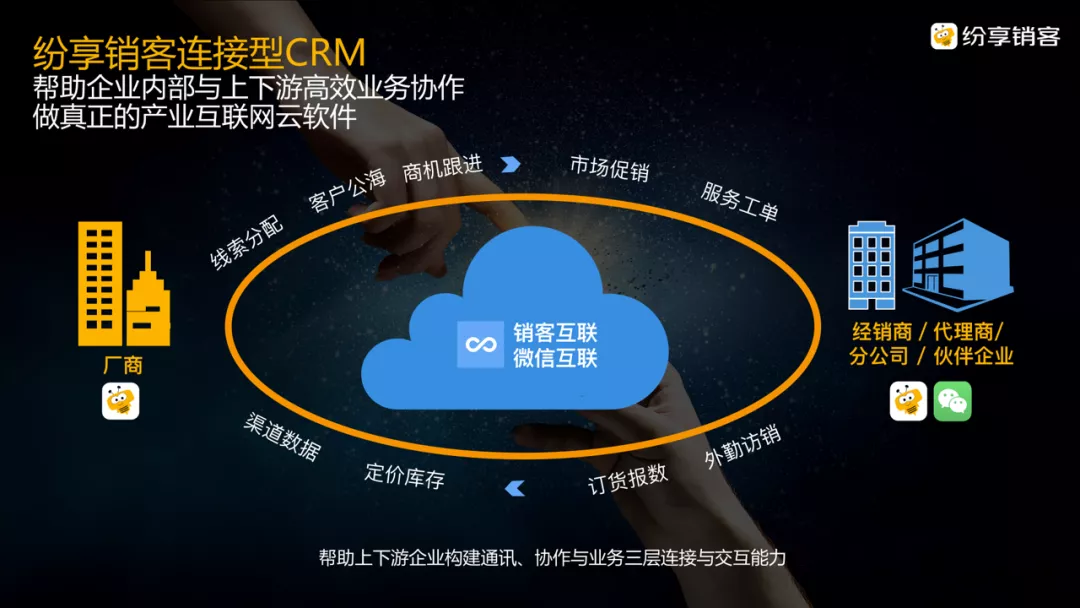 但纷享销客的连接不同,纷享销客的连接是上游CRM和下游CRM主体之间的连接。