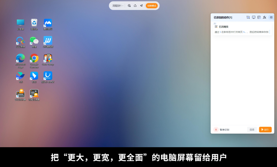 在沉浸式的流程编辑中,用户直接的工作环境,就是实在智能RPA设计器的环境。不再需要传统RPA软件的“流程画布”,把“更大,更宽,更全面”的电脑屏幕留给用户。